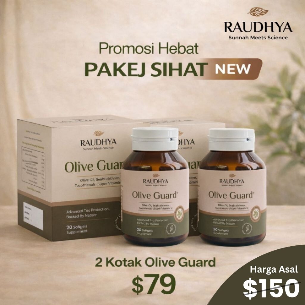 Raudhya OliveGuard+ Diperkaya Bahan Aktif Polyphenols, Tocotrienols (Super Vitamin E) & Omega Aktif Menyokong Kawalan Gula, Kolesterol & Tekanan Darah